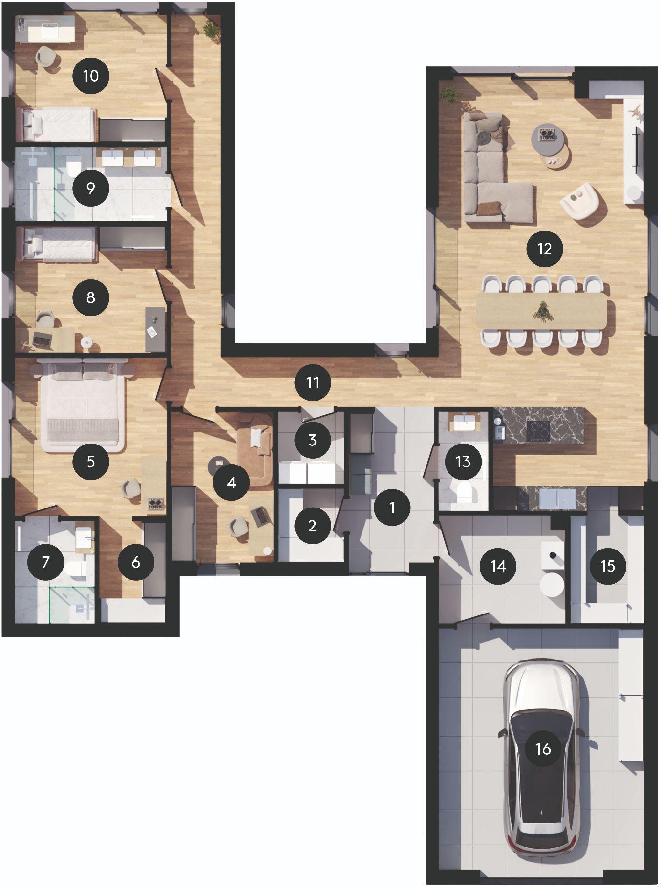 Część dzienna domu to otwarta przestrzeń z salonem, jadalnią i kuchnią, gdzie duże przeszklenia zapewniają naturalne doświetlenie i otwierają wnętrze na ogród. To serce domu, miejsce spotkań i wspólnego spędzania czasu, które podkreśla premium charakter projektu. Strefa prywatna została wyraźnie oddzielona od części wspólnej. Znajduje się tu sypialnia główna z własną garderobą, dwa dodatkowe pokoje idealne dla dzieci lub domowego biura oraz pokój gościnny. Do dyspozycji mieszkańców przewidziano dwie łazienki, a także osobną toaletę dostępną z części dziennej. Tak zaprojektowany układ gwarantuje wygodę codziennego życia i prywatność domowników, jednocześnie zachowując nowoczesną, prostą formę.