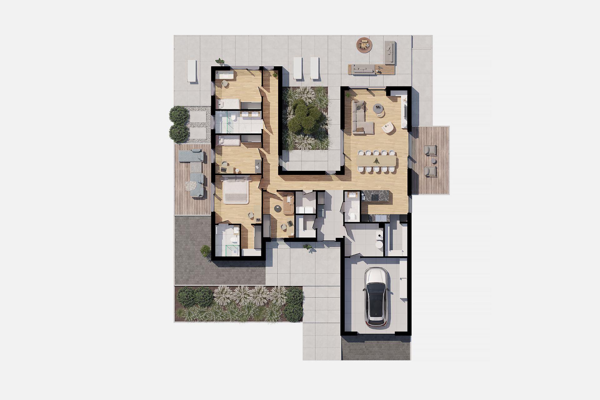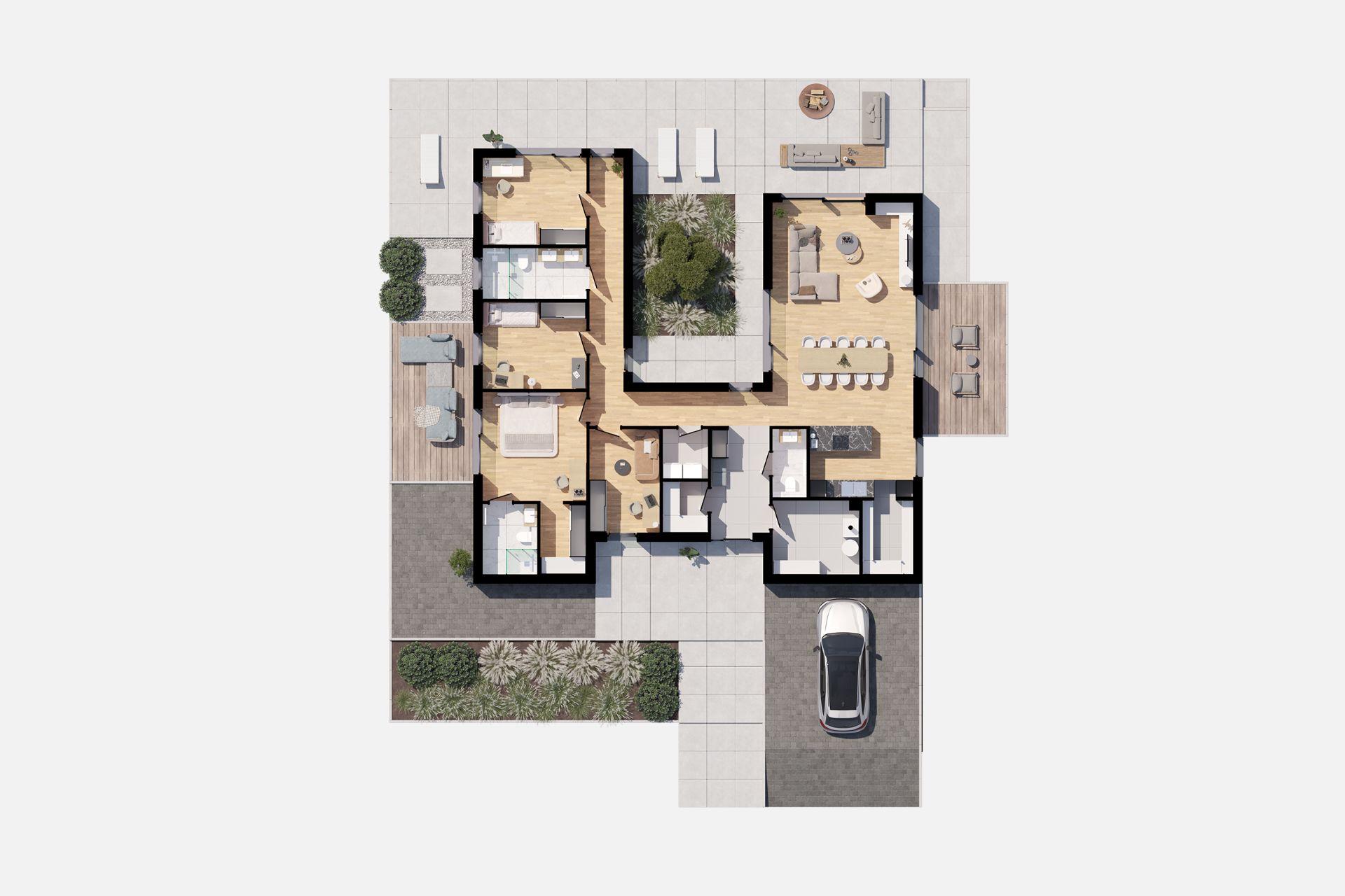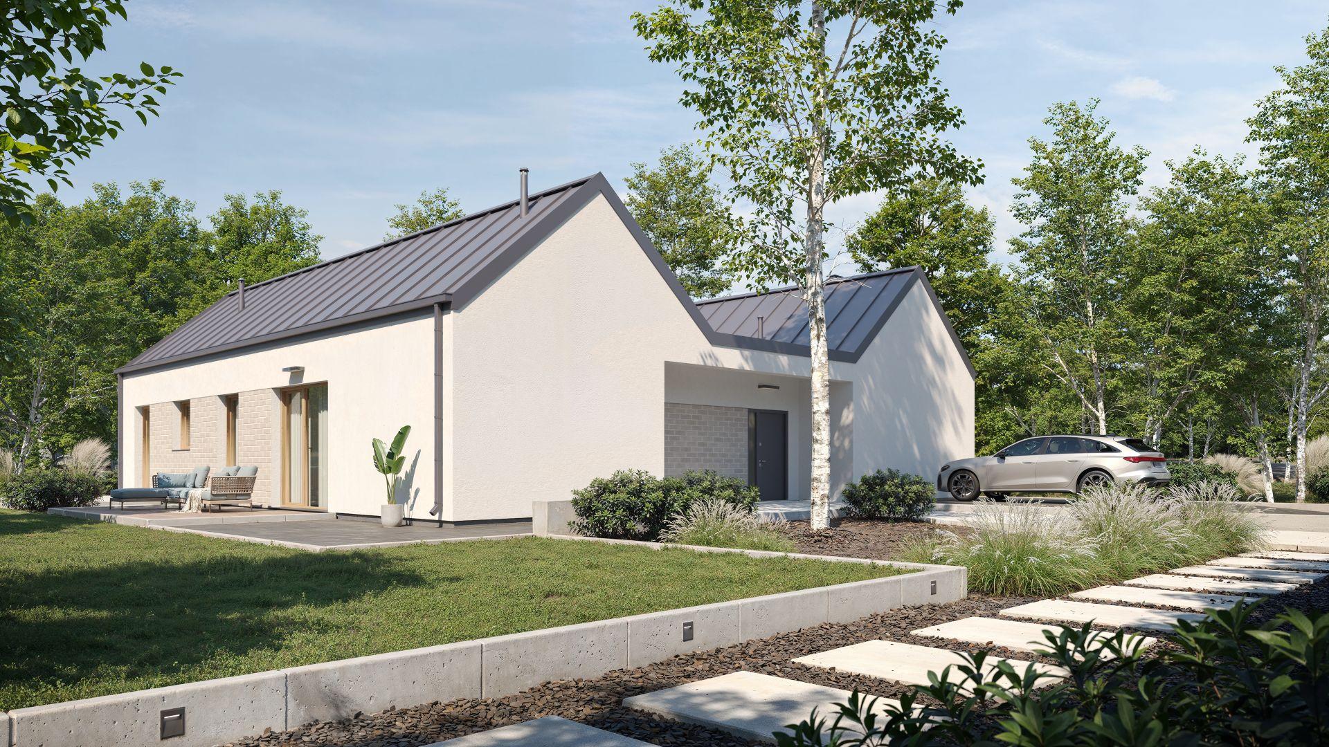 Część dzienna domu to otwarta przestrzeń z salonem, jadalnią i kuchnią, gdzie duże przeszklenia zapewniają naturalne doświetlenie i otwierają wnętrze na ogród. To serce domu, miejsce spotkań i wspólnego spędzania czasu, które podkreśla premium charakter projektu. Strefa prywatna została wyraźnie oddzielona od części wspólnej. Znajduje się tu sypialnia główna z własną garderobą, dwa dodatkowe pokoje idealne dla dzieci lub domowego biura oraz pokój gościnny. Do dyspozycji mieszkańców przewidziano dwie łazienki, a także osobną toaletę dostępną z części dziennej. Tak zaprojektowany układ gwarantuje wygodę codziennego życia i prywatność domowników, jednocześnie zachowując nowoczesną, prostą formę.