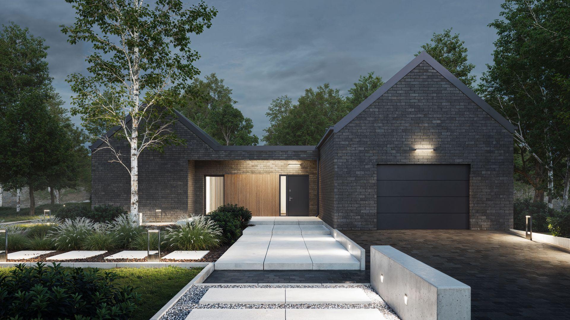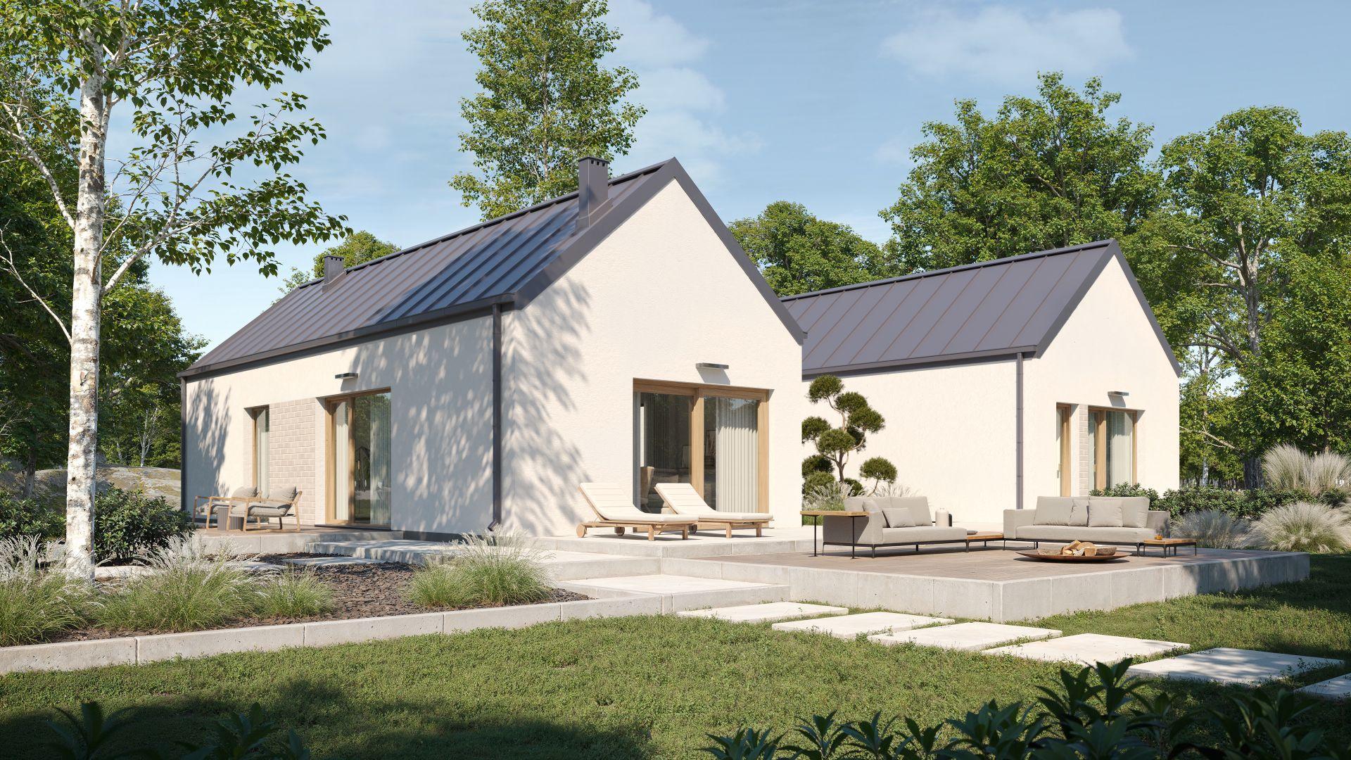 Układ domu wynika z koncepcji dwóch brył w formie nowoczesnej stodoły, połączonych minimalistycznym łącznikiem z płaskim dachem.